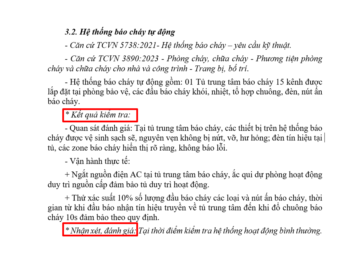 Kết quả kiểm tra bảo dưỡng hệ thống báo cháy tự động